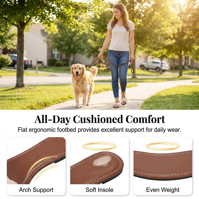 ALL-DAY CUSHIONED COMFORT - Experience unparalleled comfort with the flat, ergonomically designed footbed. The lightly cushioned brown insole supports your natural arch, making these sandals perfect for long summer walks.